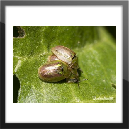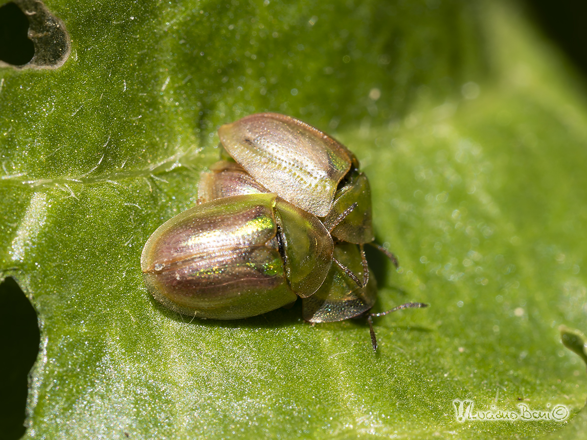 Adulti di forma ovale-convessa, con protorace ed elitre che ricoprono interamente tutte le parti del corpo; le elitre, di colore verde più o meno scuro, punteggiate, presentano due bande parallele di color verde metallico, mentre la parte inferiore del capo e il corpo sono neri.