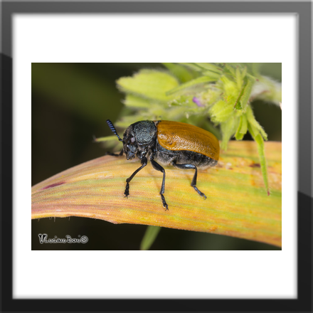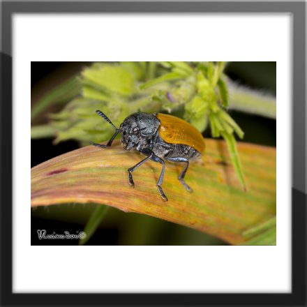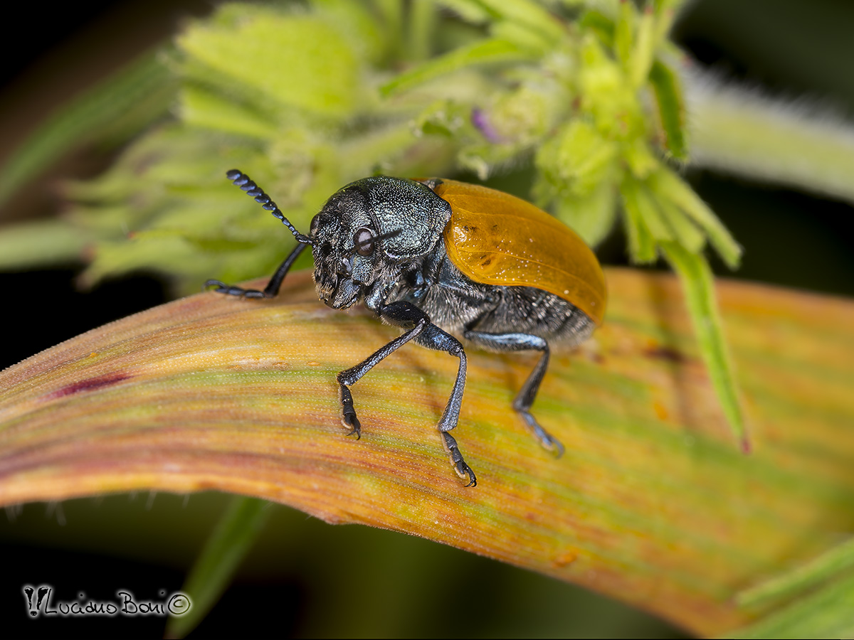 Le peculiari caratteristiche morfologiche degli adulti ne rendono immediata la differenza dai Coccinellidi con i quali viene spesso confuso dagli agricoltori e facilitano il riconoscimento dei due sessi. Il corpo è lungo fino a 12 mm, di colore nero con riflessi azzurri metallici; le antenne di 11 articoli sono dentate, il pronoto è crenulato lateralmente. Le elitre, oblunghe di colore giallo rossastro, sono prive di macchie e, come il pronoto, sono punteggiate; i maschi hanno le zampe anteriori lunghe circa il doppio di quelle delle femmine e sono dotate di unghie che vengono utilizzate per ancorarsi e trattenere le compagne durante l’accoppiamento che avviene sulle piante nutrici. Le femmine fecondate si trasferiscono su varie essenze erbacee dove, aiutandosi con le zampe posteriori, depongono alcune uova ciascuno dei quali viene avvolto da escrementi a formare una sorta di astuccio detto scatoconca; l’uovo è munito di un filamento che lo ancora al substrato insieme alle altre uova del medesimo gruppo. Nonostante tali accorgimenti le uova vengono parassitizzate dall’imenottero Triccogrammatude solitario Bloodiella andalusiaca Nowicki, 1935; che vive anche a spese delle uova del Crisomelide Clitrino Macrolenes dentipes (Olivier,1808).