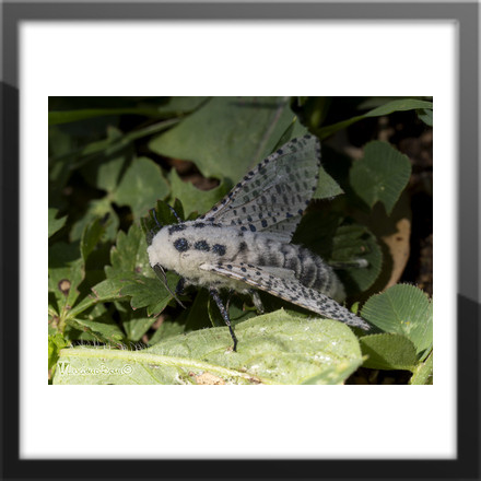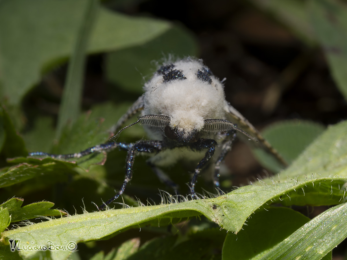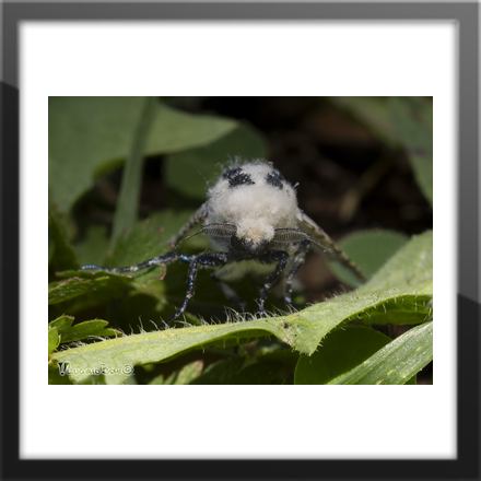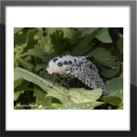 Le ali si presentano bianche maculate di nero dai riflessi bluastri; il torace, anch'esso di colore bianco, è ricoperto da una peluria vellutata; sul quale spiccano sei macchie nere disposte su due file; l'addome è scuro e allungato.